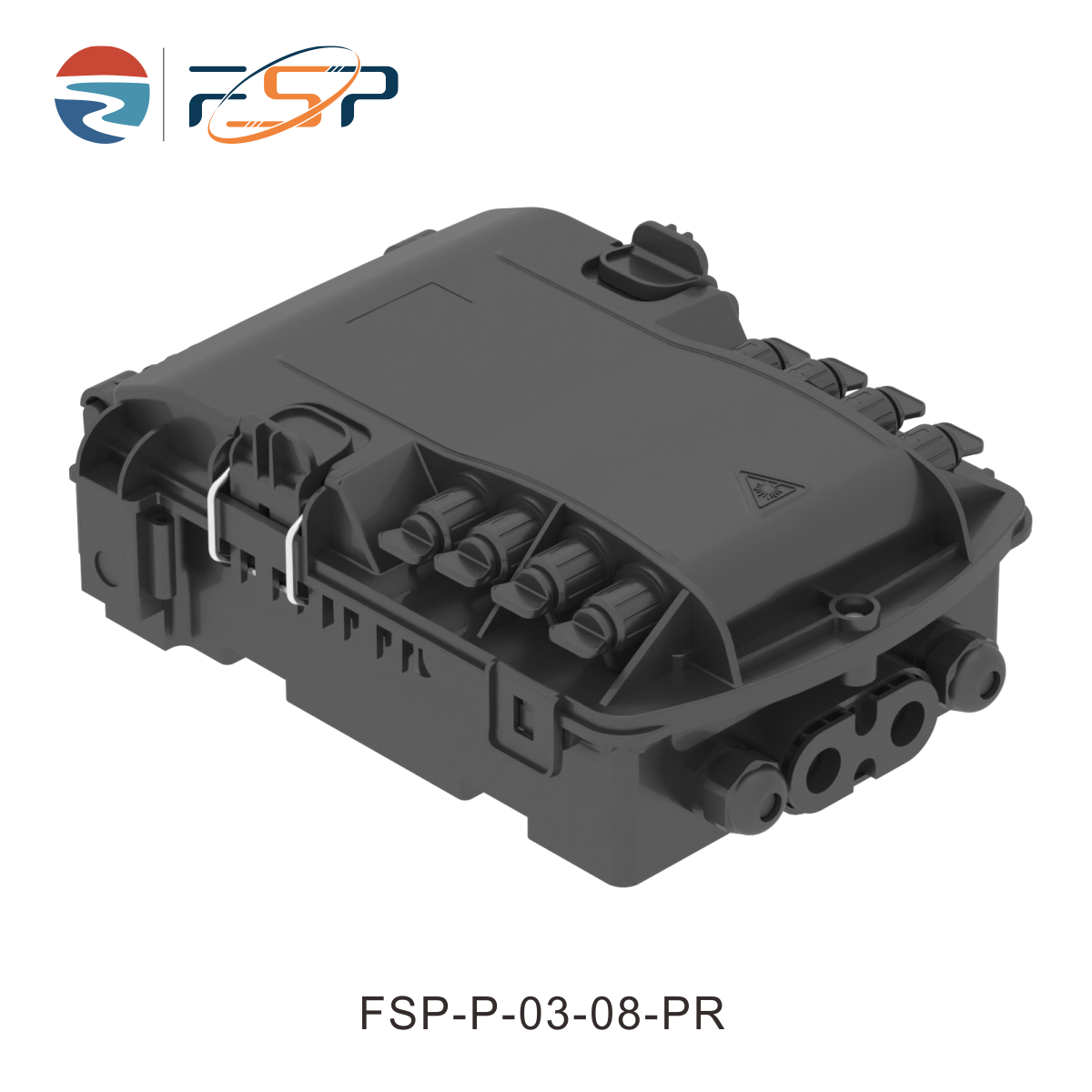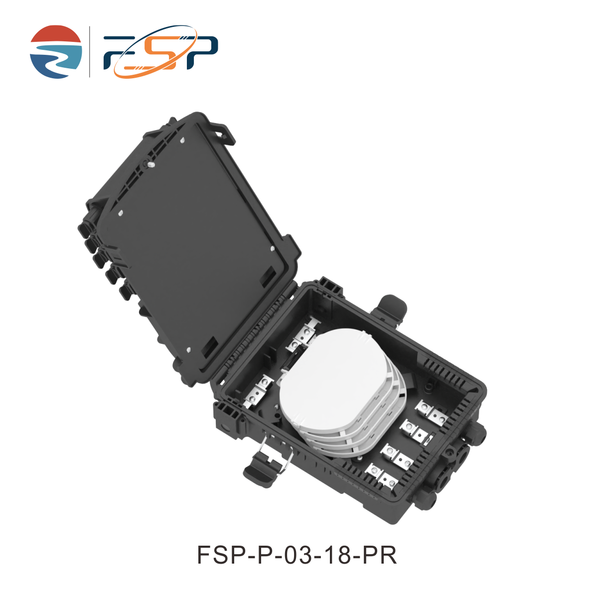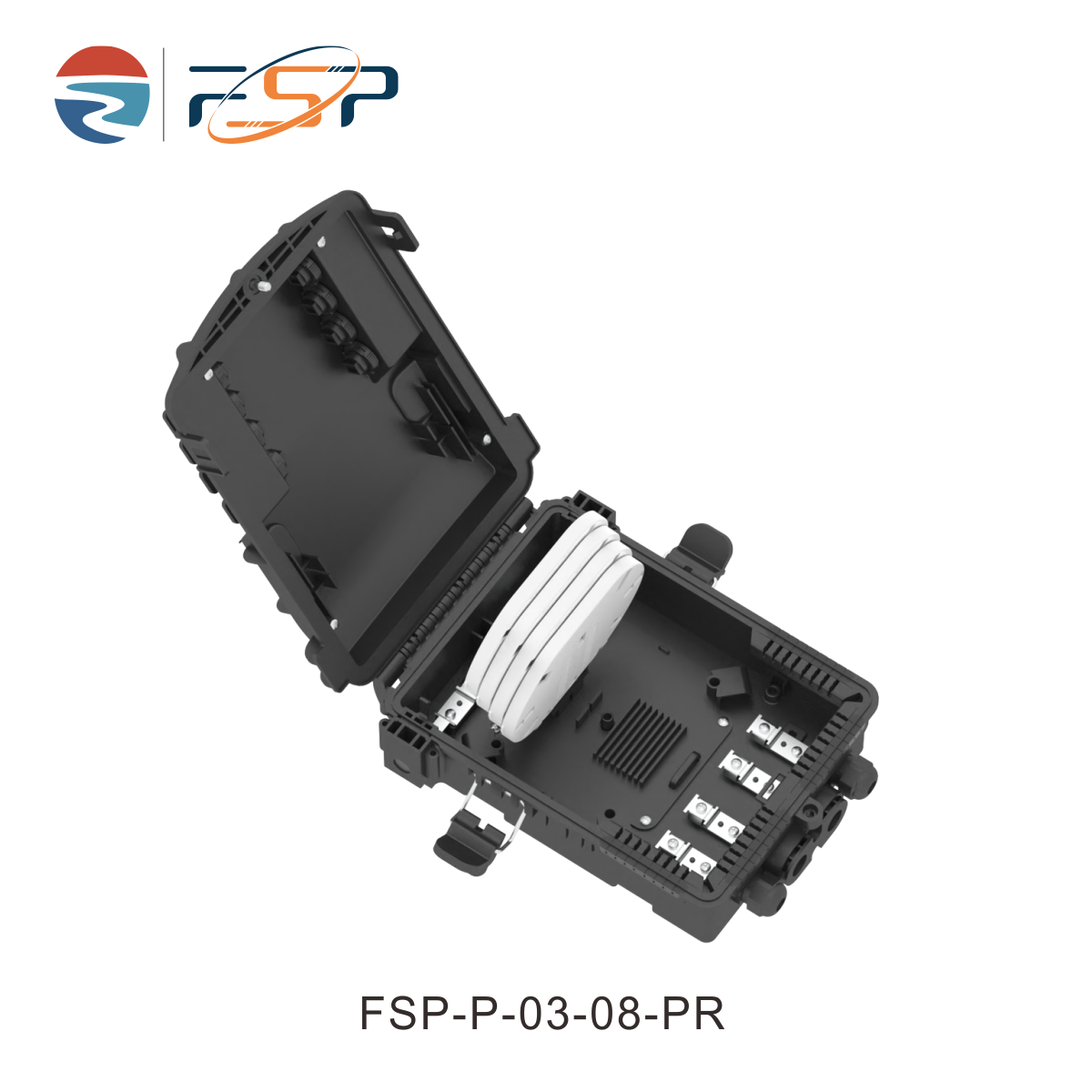 FSP-P-03 Series Fiber Distribution Box is used as a termination point for the feeder cable to connect with drop cable in FTTx communication network system. The fiber splicing, splitting, and distribution can be done in this box, and meanwhile it provides solid protection and management for the FTTx network building.
