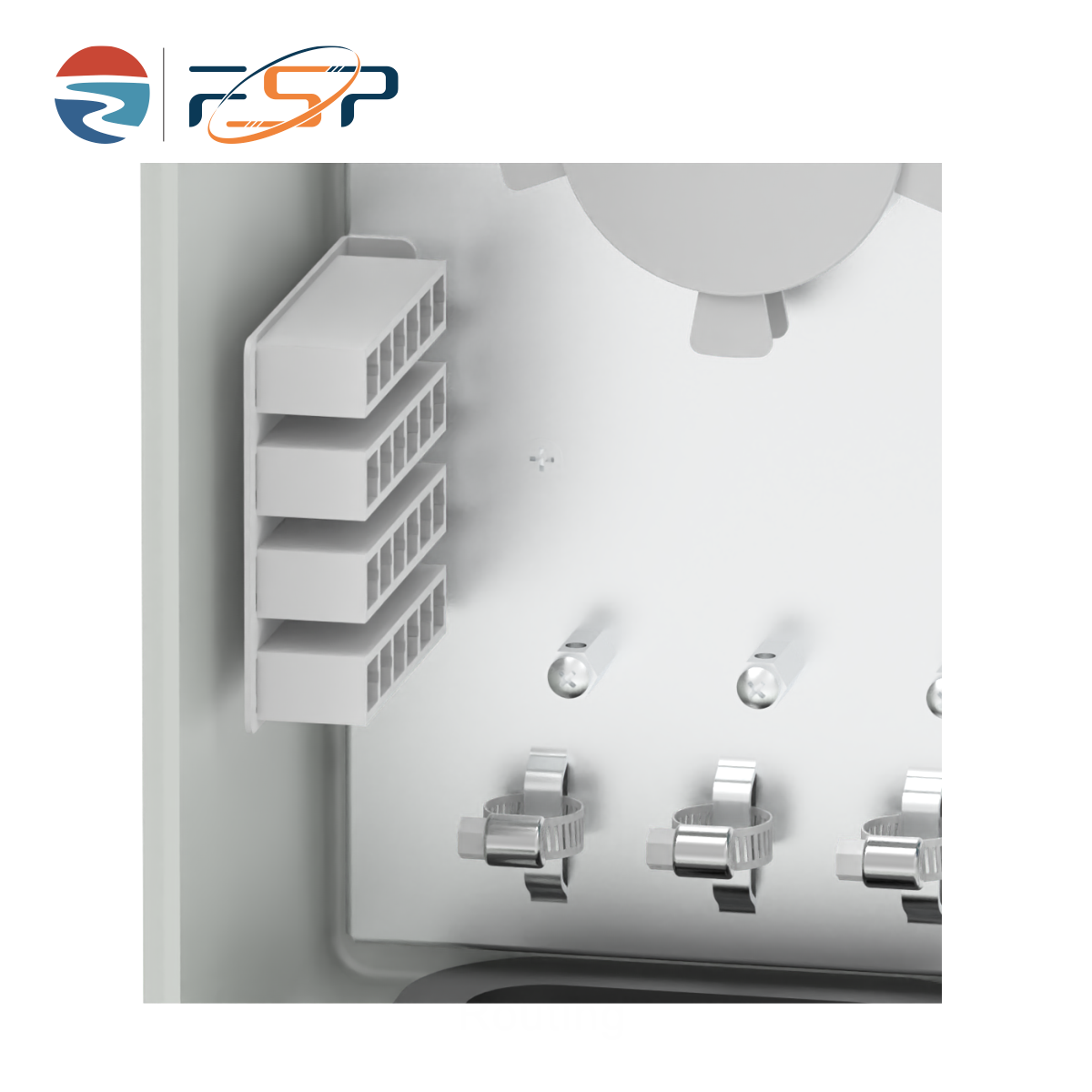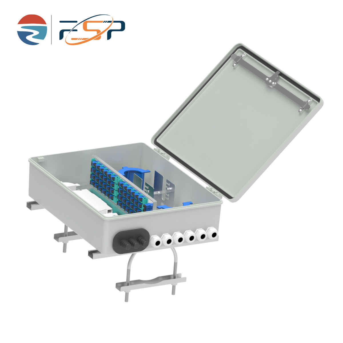 FSP-SM-48A Fiber Distribution Box is used as a terminal point for the feeder cable to connect with drop cable in telecommunication network system. The fiber splicing, splitting, distribution can be done in this box, and meanwhile it provides protection and management for the FTTx network building.