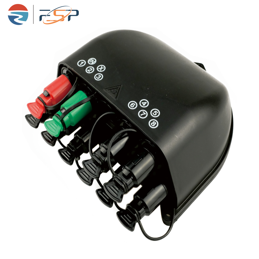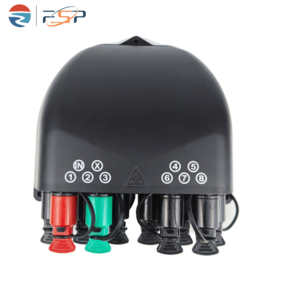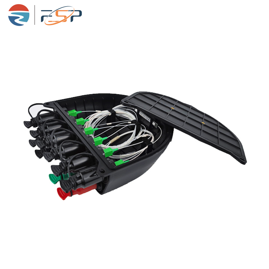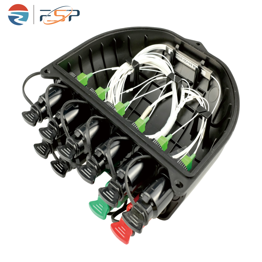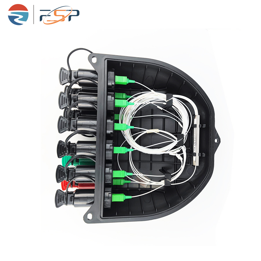 FSP-P-08-D Fiber Distribution Box is used as a termination point for the feeder cable to connect with drop cable in FTTx communication network system. The fiber splicing, splitting, and distribution can be done in this box, and meanwhile it provides solid protection and management for the FTTx network building.