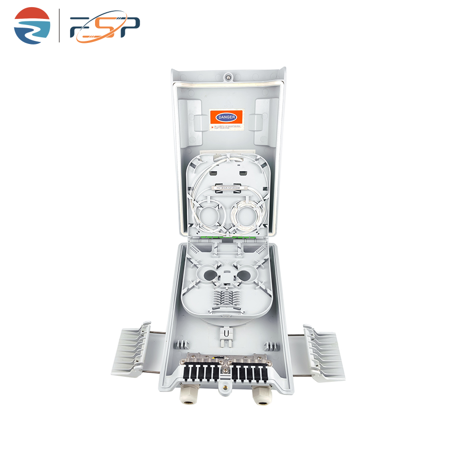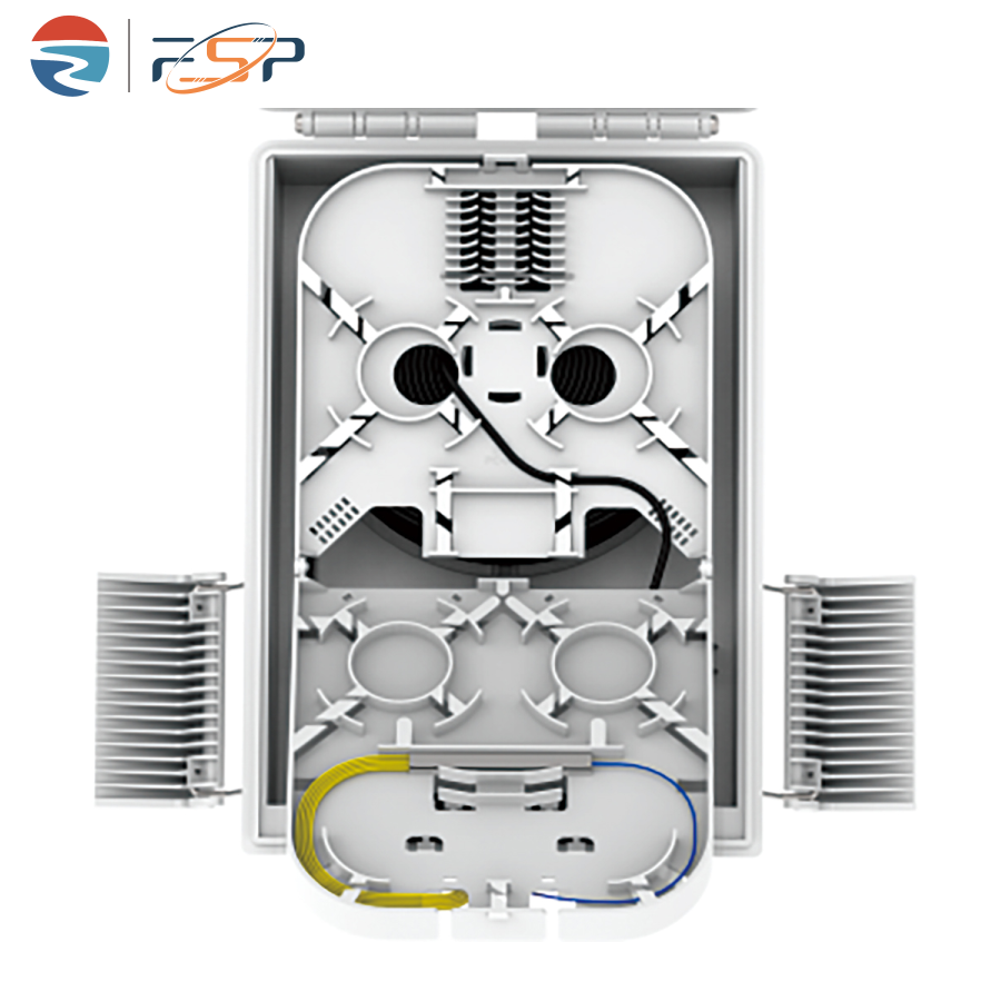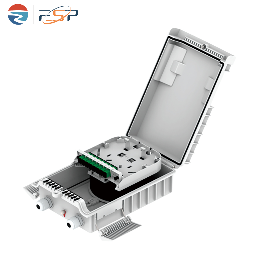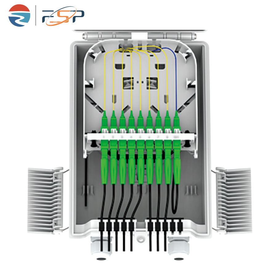 FSP-P-08-F Fiber Distribution Box is used as a termination point for the feeder cable to connect with drop cable in FTTx communication network system. The fiber splicing, splitting, and distribution can be done in this box, and meanwhile it provides solid protection and management for the FTTx network building.