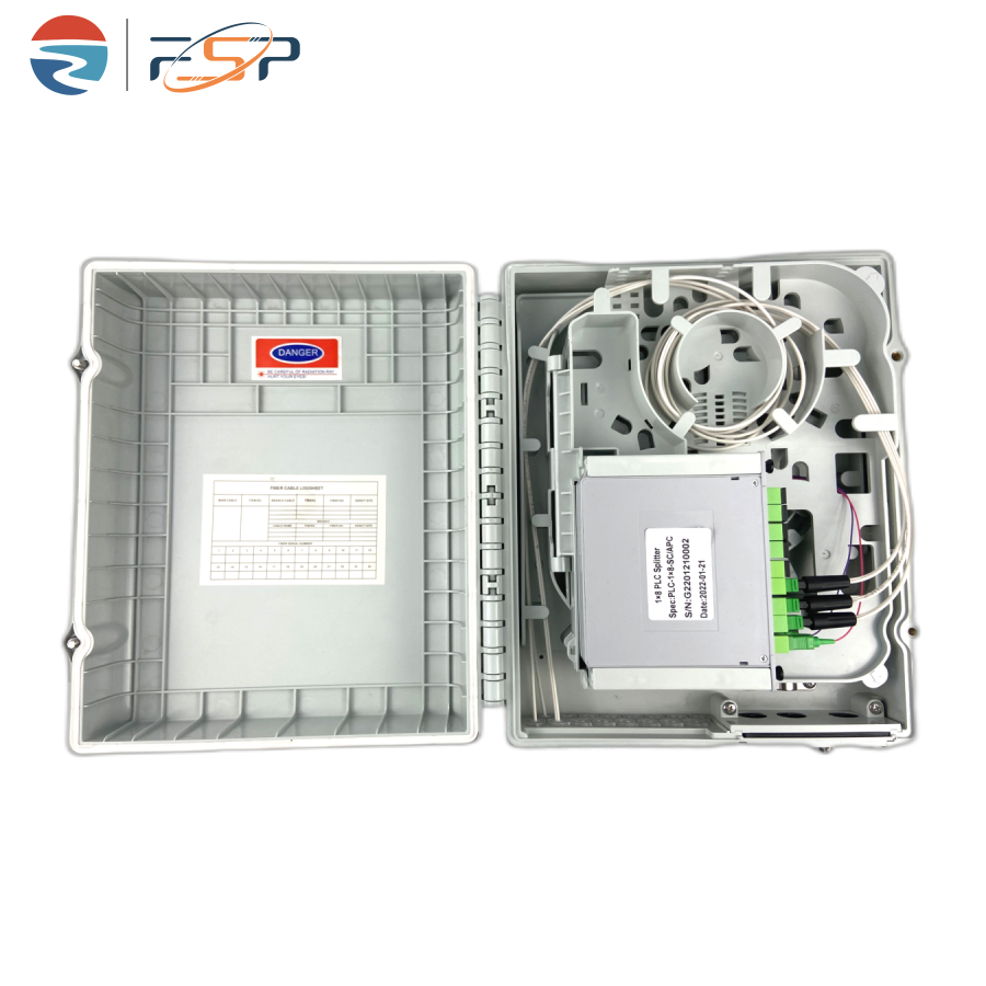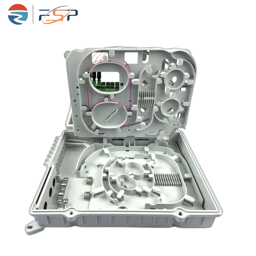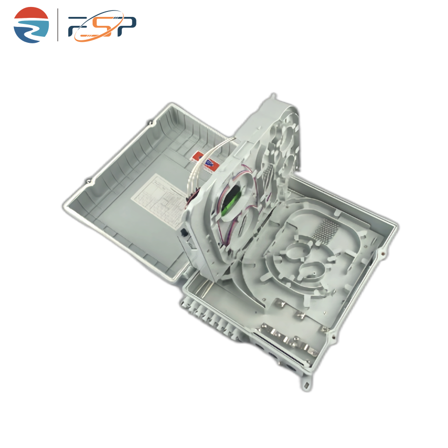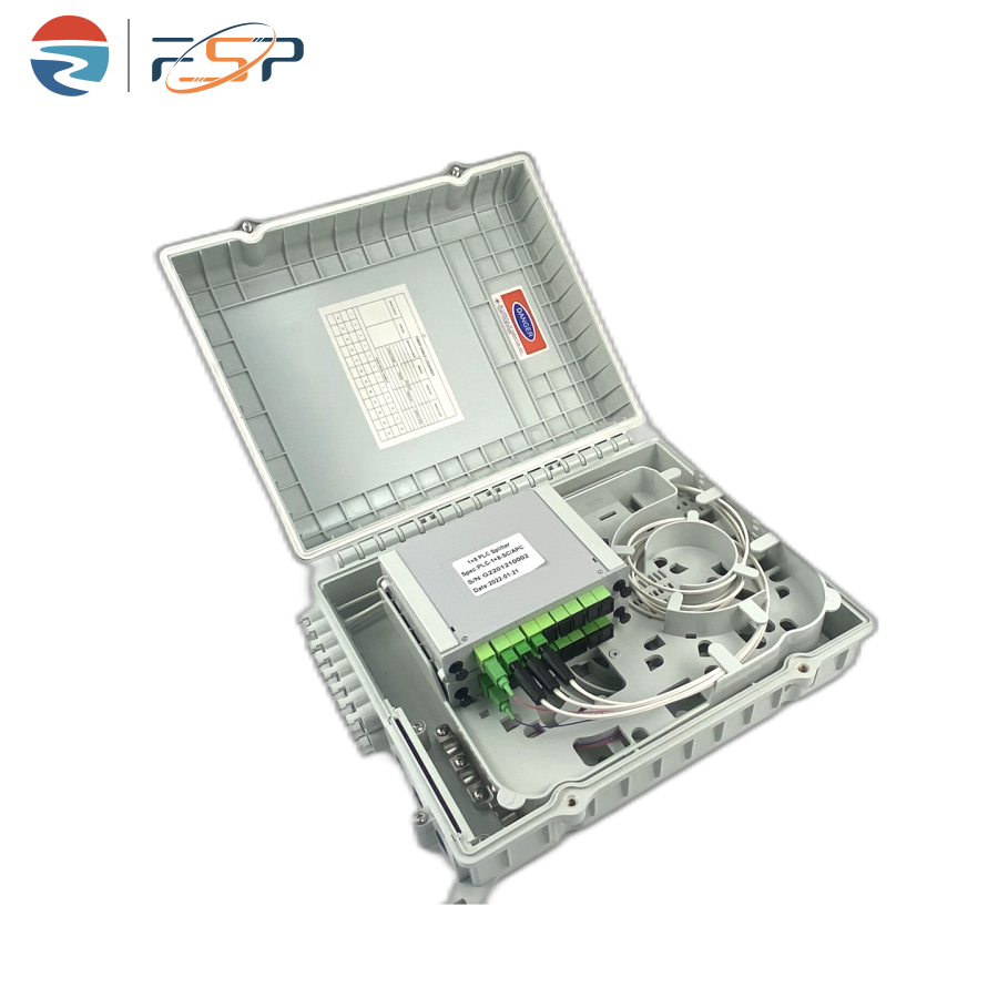 FSP-P-16-F Fiber Distribution Box is used as a termination point for the feeder cable to connect with drop cable in FTTx communication network system. The fiber splicing, splitting, and distribution can be done in this box, and meanwhile it provides solid protection and management for the FTTx network building.