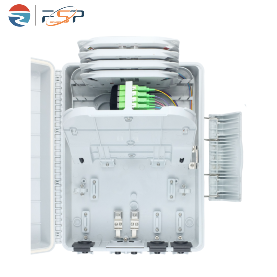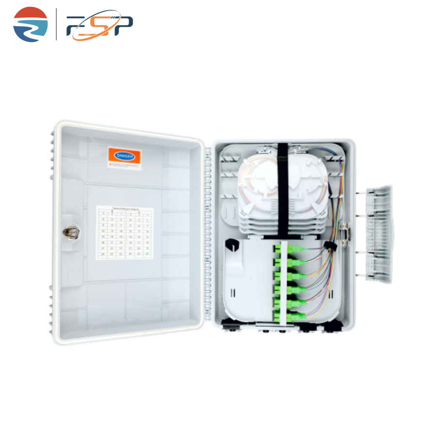 FSP-P-24-B Fiber Distribution Box is used as a termination point for the feeder cable to connect with drop cable in FTTx communication network system. The fiber splicing, splitting, and distribution can be done in this box, and meanwhile it provides solid protection and management for the FTTx network building.