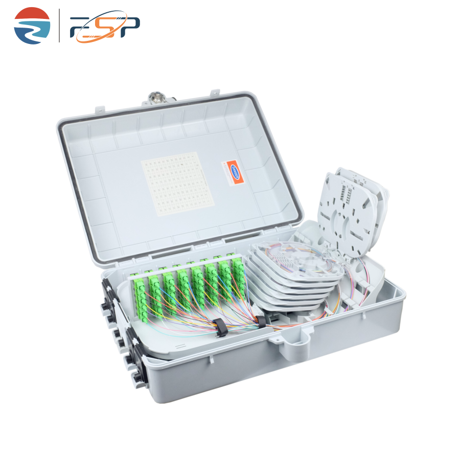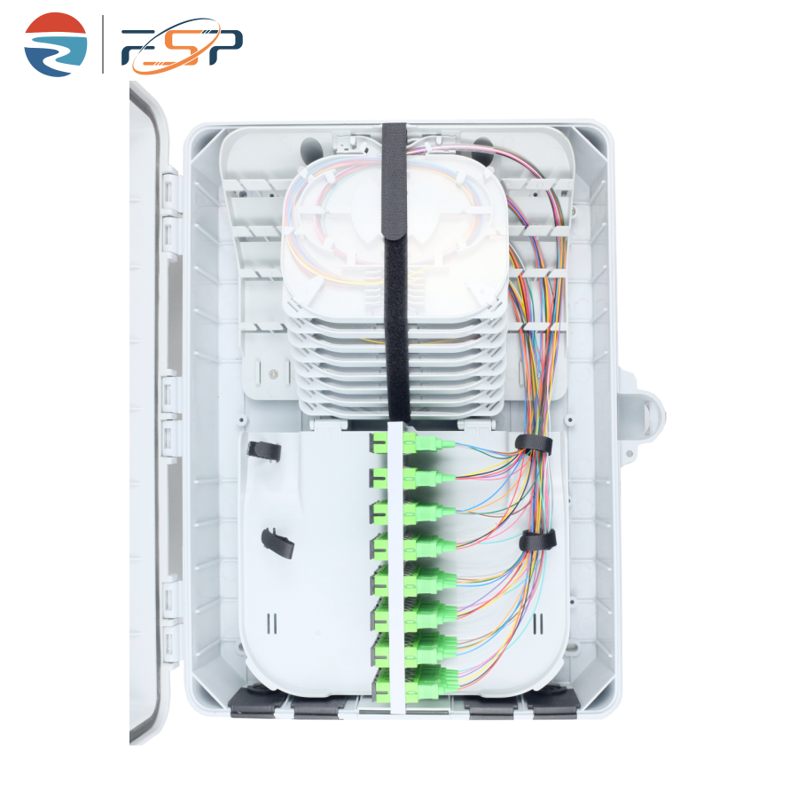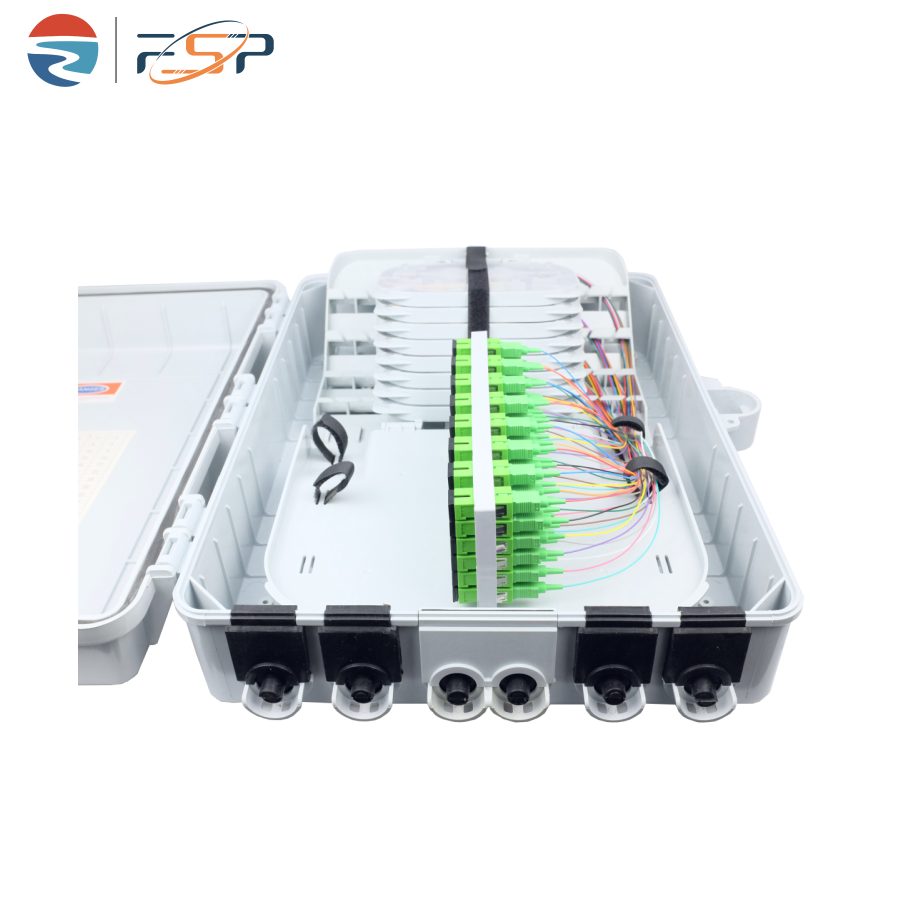 FSP-P-48-A Fiber Distribution Box is used as a termination point for the feeder cable to connect with drop cable in FTTx communication network system. The fiber splicing, splitting, and distribution can be done in this box, and meanwhile it provides solid protection and management for the FTTx network building.