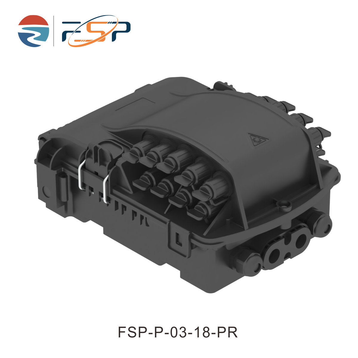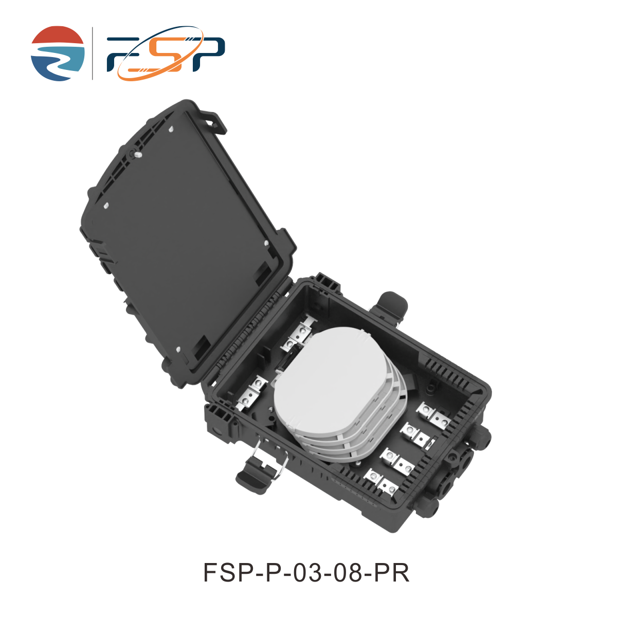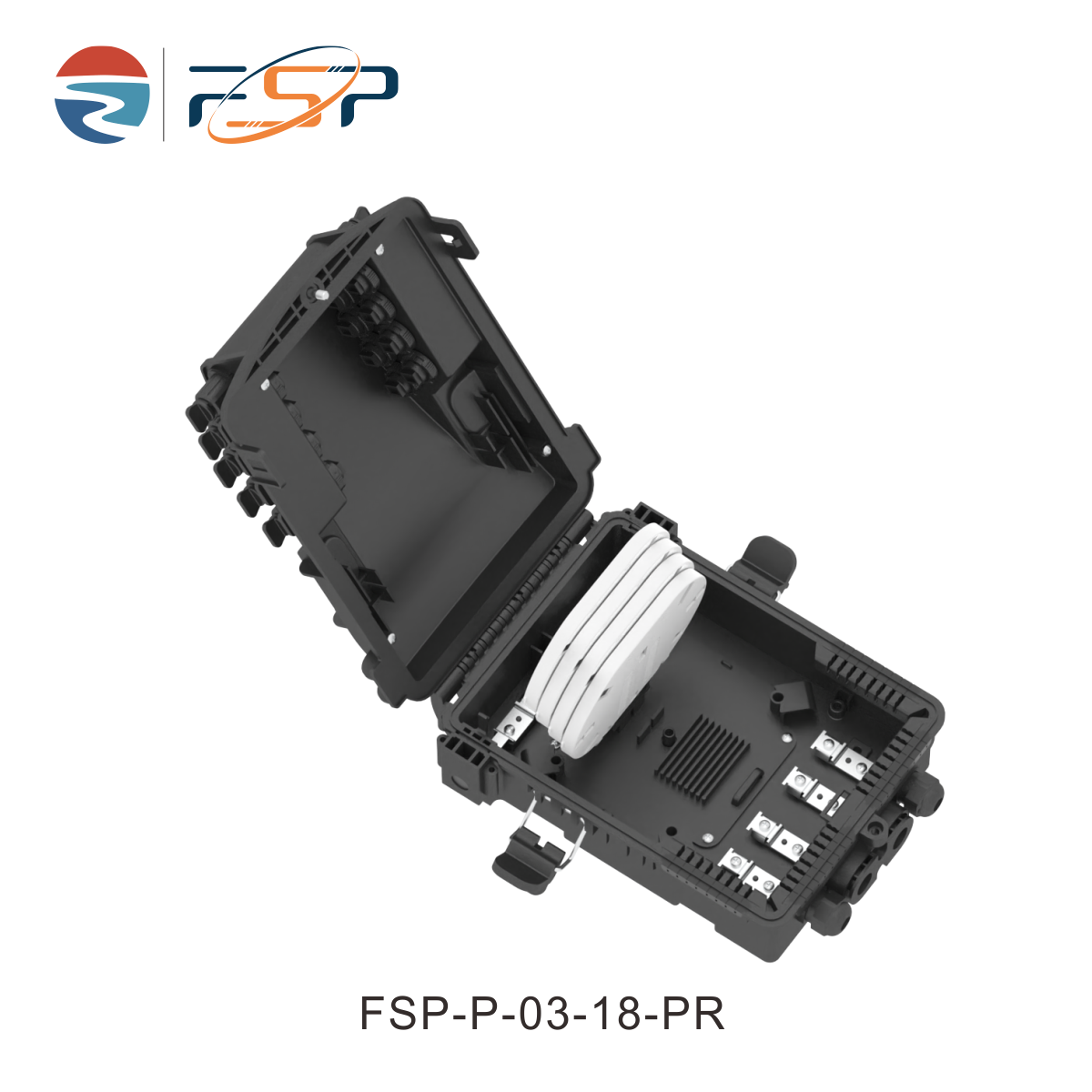 FSP-P-03 Series Fiber Distribution Box is used as a termination point for the feeder cable to connect with drop cable in FTTx communication network system. The fiber splicing, splitting, and distribution can be done in this box, and meanwhile it provides solid protection and management for the FTTx network building.