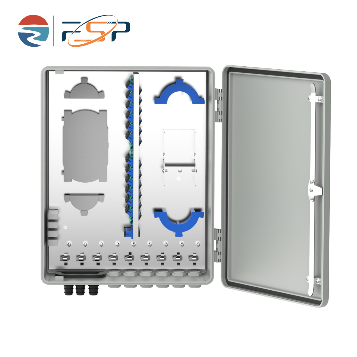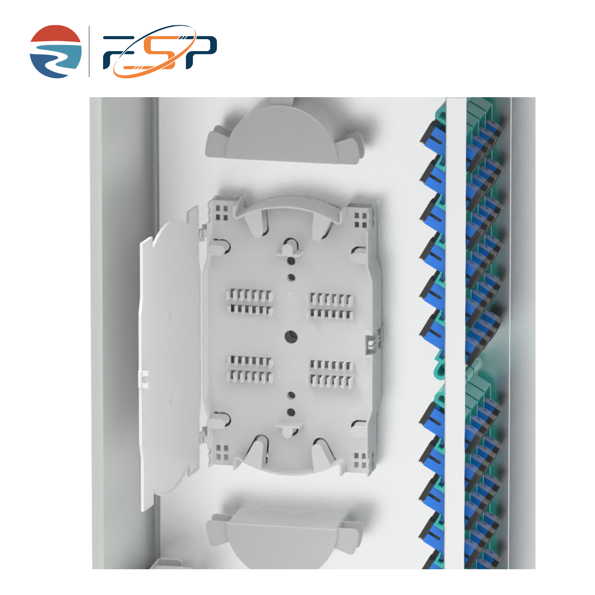 FSP-SM-48A Fiber Distribution Box is used as a terminal point for the feeder cable to connect with drop cable in telecommunication network system. The fiber splicing, splitting, distribution can be done in this box, and meanwhile it provides protection and management for the FTTx network building.